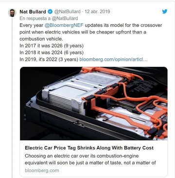 According to Nathaniel Bullard, an analyst at Bloomberg NEF (New Energy Finance) in 2015, 50% of the cost of an electric car corresponded to the battery. That percentage is currently 33% and will fall to 20% in the middle of this decade. “Achieving parity in the initial cost means that the buying trend is close to leaning in favor of electric vehicles,” they say in Think Progress. “And it also means the beginning of decarbonization of much of the transport sector.”